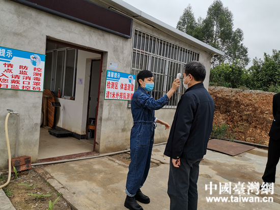 金立泰生態(tài)畜牧養(yǎng)殖場對進(jìn)出人員進(jìn)行體溫檢測。 (中國臺灣網(wǎng) 發(fā))