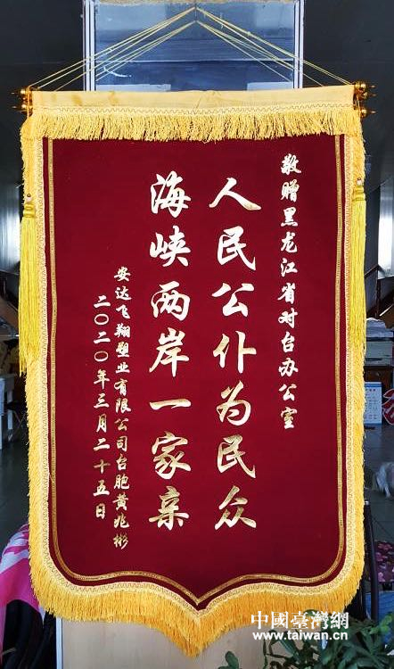 中國臺灣網(wǎng)3月29日訊 3月27日,黑龍江省委臺辦收到安達(dá)飛翔塑業(yè)有限公司經(jīng)理臺胞黃兆彬先生送來的寫著“人民公仆為民眾,海峽兩岸一家親”的錦旗。
