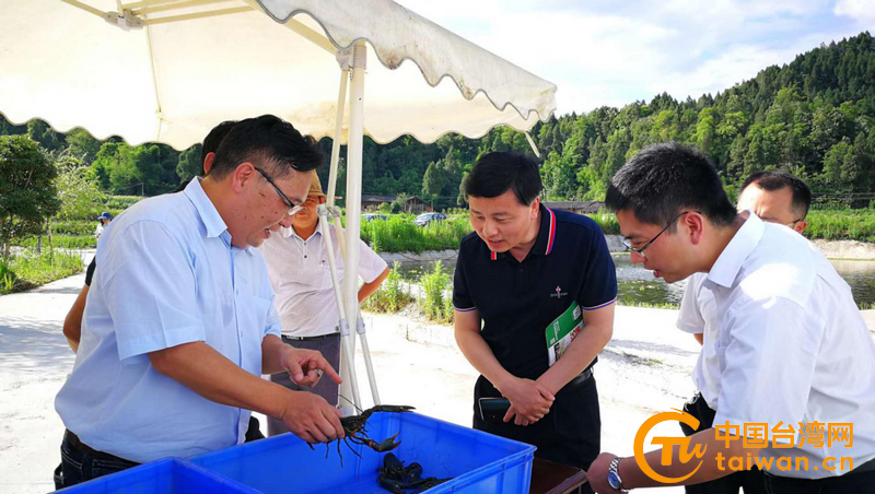 袁明副主任詳細了解川臺緣公司澳洲小龍蝦養殖情況(圖片來源:四川省臺辦)