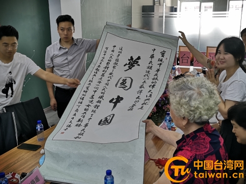 煙臺社區居民張作信展示了《夢回中國》書法(圖片來源:山東煙臺市臺港澳辦)