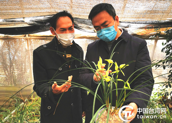 玉溪市委統(tǒng)戰(zhàn)部常務(wù)副部長何國斌(右)到洪文山蘭花基地調(diào)研。(玉溪市委臺辦供圖)