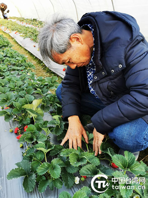 陳政沼實地考察草莓長勢。(玉溪市委臺辦供圖)