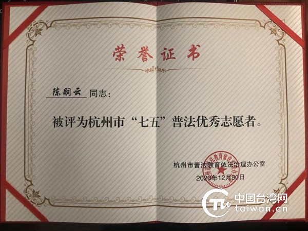 陳嗣云被評(píng)為杭州市“七五”普法優(yōu)秀志愿者。(圖片來(lái)源:杭州市臺(tái)辦供圖)
