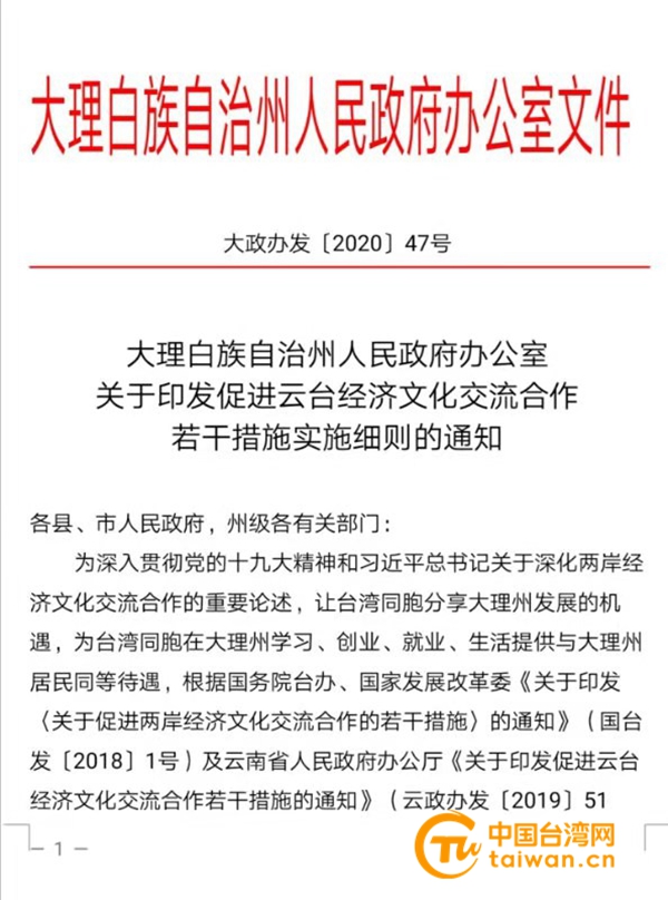 云南省大理州發布惠臺“50條措施”