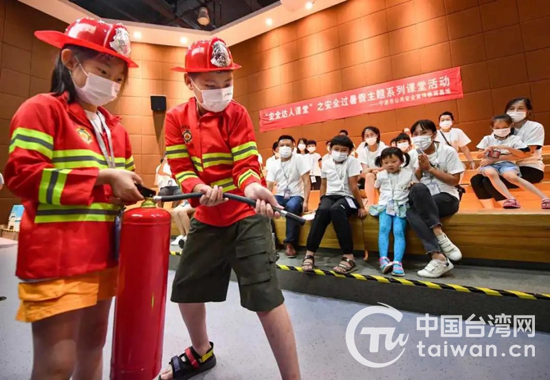 來自臺灣南投縣的何承恩小朋友(前右)在學(xué)習(xí)干粉滅火器使用方法(圖片來源:寧波市臺辦)