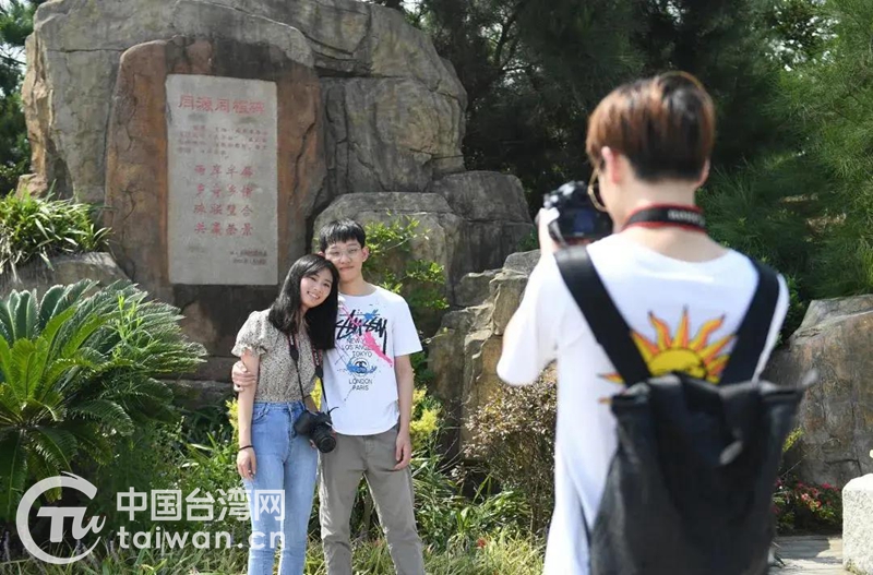 一對臺灣情侶在洞頭半屏山以同源同根碑為背景合影(圖片來源:浙江省臺辦)