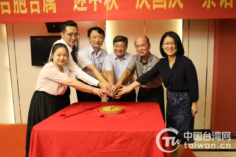 楊育智(右三)與臺商臺胞代表一起分享中秋月餅(圖片來源:廣西賀州市臺辦)