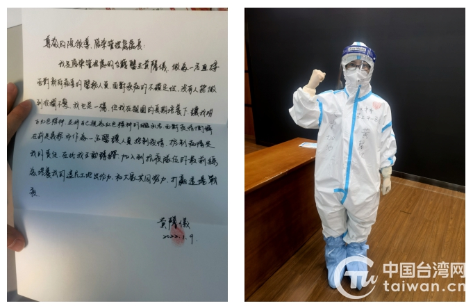 中國臺灣網1月14日訊 “在此我主動請纓,加入到抗疫隊伍的最前線,為培養我的這片土地出份力……”此次奧密克戎疫情襲來,天津第三中心醫院臺灣籍醫生黃馨儀第一時間手寫《請戰書》遞交醫院,主動申請進“紅區”,參與患者醫療救治工作。那鮮紅的指印,正如她那顆抗擊疫情義無反顧的心。