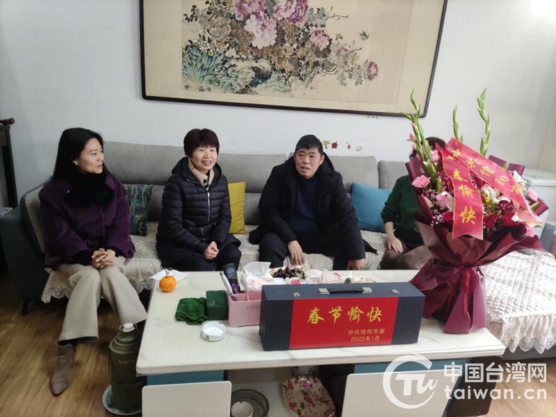 中國臺灣網2月7日訊 春節前夕,信陽市委統戰部二級巡視員徐一帶領市臺辦、臺聯工作人員對部分定居臺胞、常住臺胞、陸配在信親屬和臺資企業走訪慰問,送去慰問品和新春祝福。