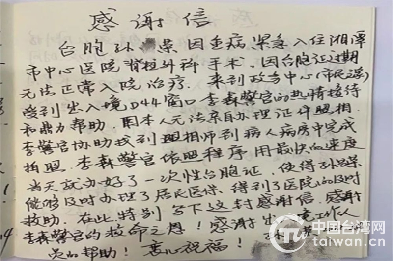 中國臺灣網3月11日訊 近日,臺胞孫某榮委托其親屬將手寫的感謝信送到了市民之家湘潭公安專區(qū)出入境窗口民警手中,以表達對湘潭公安民警的感激之情。