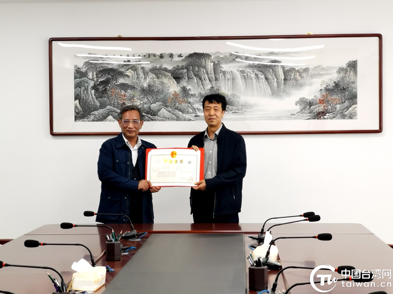 晉中市臺(tái)辦主任張國(guó)新將《山西零點(diǎn)倍增產(chǎn)業(yè)園運(yùn)營(yíng)管理有限公司營(yíng)業(yè)執(zhí)照》交到臺(tái)灣青年聯(lián)合會(huì)融媒體中心主任洪盛興手中。(圖片來(lái)源:晉中市臺(tái)辦)