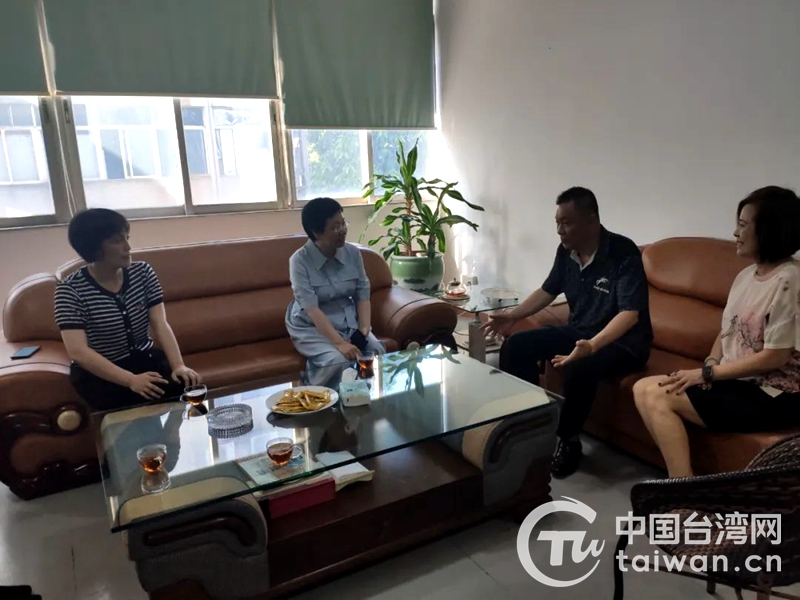 蔡英姿(左二)與汕頭市好鼎貿(mào)易有限公司負(fù)責(zé)人座談(圖片來(lái)源:汕頭市臺(tái)辦)