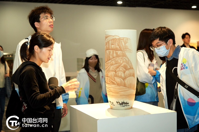 白亦佼老師(左一)為兩岸青年講述參展藝術品的創作過程和創作歷史(中國臺灣網 發)