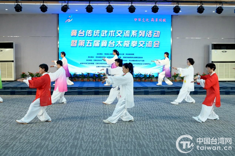 交流會現場,河北省非物質文化遺產楊氏太極拳傳承人,臺灣傳統楊氏、鄭子、陳氏太極拳名家,全國青少年武術冠軍、島內中小學武術愛好者,以及來自河北省武術協會、石家莊市武術協會、臺灣中華洪門武術聯盟、高雄市海峽兩岸太極拳交流協會、邯鄲市永年區青少年太極拳文化協會等冀臺兩地傳統武術協會、社團的展演人員共計90余人,展示了多個太極拳流派技術和源自河北的傳統武術套路技法。