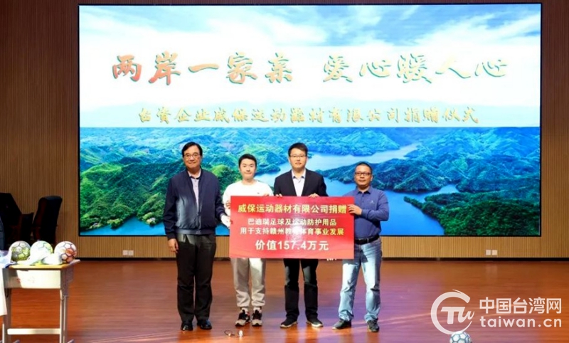 中國臺灣網11月24日訊 近日,“兩岸一家親 愛心暖人心”臺資企業威保運動器材有限公司捐贈儀式在江西理工大學附屬金嶺學校舉行。