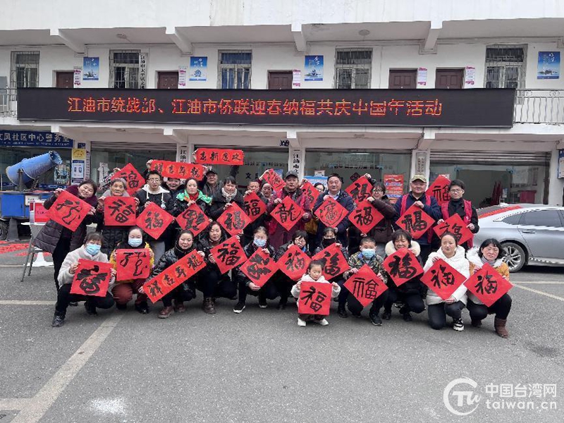 江油市臺(tái)辦近日組織開(kāi)展“迎春納福、共慶中國(guó)年”系列活動(dòng),邀請(qǐng)書(shū)法家為臺(tái)胞臺(tái)屬寫(xiě)春聯(lián)、寫(xiě)“!弊郑l(fā)放《川臺(tái)70條》等宣傳冊(cè)和新年文創(chuàng)禮品,與臺(tái)胞臺(tái)屬共迎新春佳節(jié)。