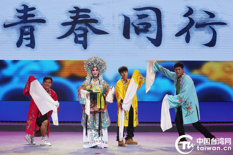 兩岸青年在海峽兩岸(泰州)梅蘭芳藝術(shù)文化周開(kāi)幕上表演自創(chuàng)潮戲曲《戲說(shuō)泰州》。(中國(guó)臺(tái)灣網(wǎng)發(fā))