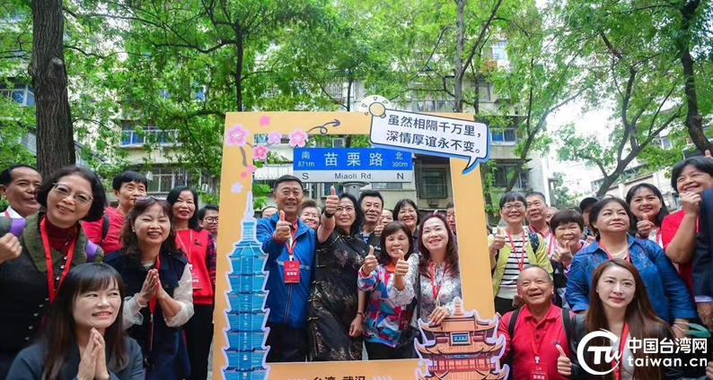 47名來自臺灣苗栗縣的客人到武漢市江岸區臺北街道的苗栗路打卡。(湖北省臺辦供圖)