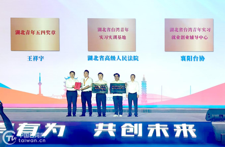 現(xiàn)場舉行頒授儀式,為王祥宇頒授“湖北省五四青年獎?wù)隆保瑸楹笔「呒壢嗣穹ㄔ杭跋尻柵_協(xié)分別頒授“湖北省臺灣青年實(shí)習(xí)實(shí)訓(xùn)基地”“湖北省臺灣青年實(shí)習(xí)就業(yè)輔導(dǎo)中心”牌匾。