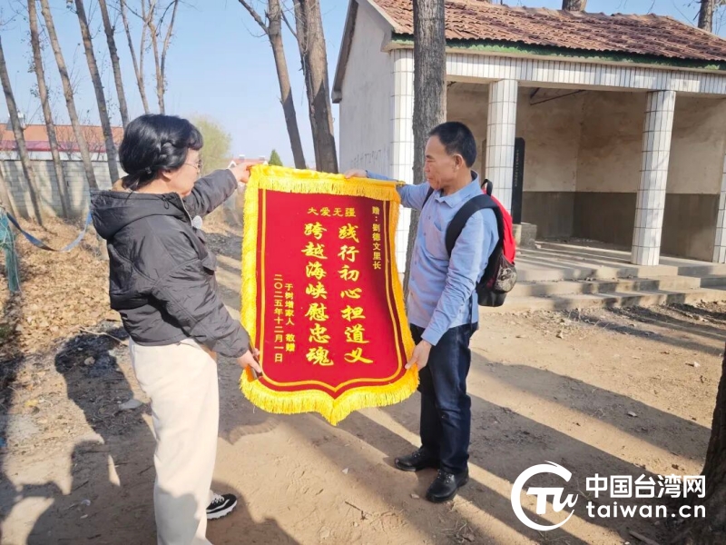 今年8月,于雪燕通過網絡了解到劉德文多年來協助老兵魂歸故里的事跡,隨即與他取得聯系。劉德文輾轉查詢、幾經核對,在臺灣彰化縣找到于樹增生前居住的養老院以及骨灰安葬地。劉德文是臺灣高雄市一位里長,自2003年起,他已先后護送300多位老兵的骨灰回到大陸故鄉安葬,其中山東籍老兵有72位。為了感謝劉德文的幫助,于雪燕將印有“踐行初心擔道義 跨越海峽慰忠魂”的錦旗送給劉德文。