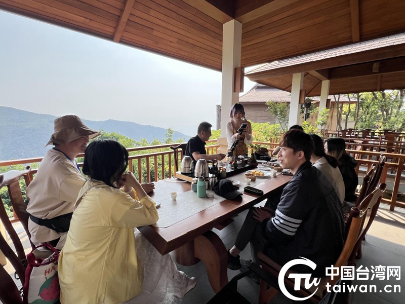 在滄源佤族自治縣的榮康達茶葉基地,采訪團一行逛游茶園,了解該基地及臨滄茶產(chǎn)業(yè)的發(fā)展。這是臺灣青年和自媒體博主圍坐品茶、拍攝。(中國臺灣網(wǎng)記者 劉琳 攝)