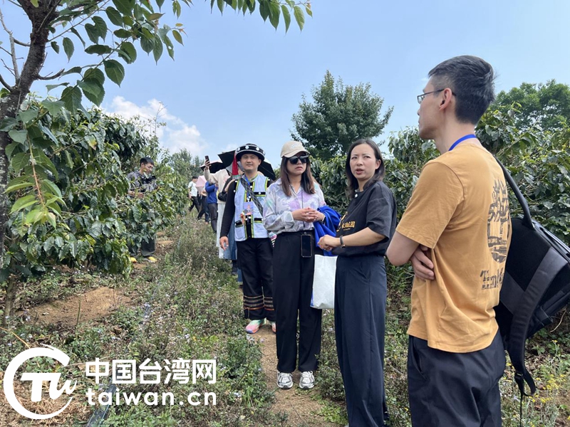 在滄源佤族自治縣的咖啡種植莊園,采訪團一行向莊園合伙人了解其咖啡種植、生產(chǎn)加工情況。(中國臺灣網(wǎng)記者 劉琳 攝)
