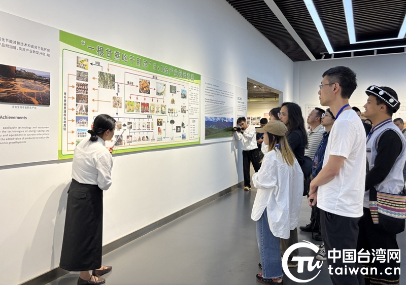 在耿馬傣族佤族自治縣的蔗糖文化展示中心,采訪團一行聆聽講解員介紹當?shù)亍耙桓收岢愿捎帽M”的甘蔗綜合利用鏈。(中國臺灣網(wǎng)記者 劉琳 攝)