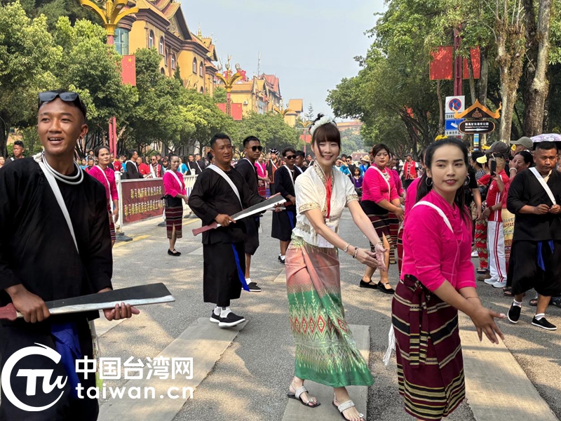 在耿馬傣族佤族自治縣觀看民族團結(jié)方陣巡游展示時,臺灣自媒體人王安琪自發(fā)加入巡游隊伍,與當?shù)孛癖娨煌~起歡快舞步。(中國臺灣網(wǎng)記者 劉琳 攝)