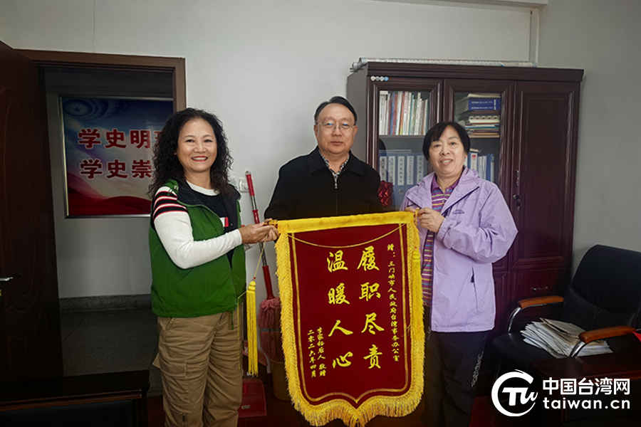 抗日英烈李家鈺將軍的孫女李寧、外孫女陳溦為三門峽市臺(tái)辦工作人員送錦旗。(中國臺(tái)灣網(wǎng)發(fā))