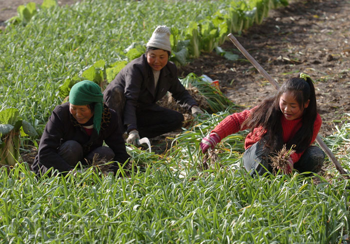 12月23下午,在甘肅省隴南市文縣境內的白龍江岸邊,臨江鎮三灣村14歲的6年級小姑娘王文米(右),正利用放寒假的時間和嬸子高建玉(左)、媽媽王愛蓮(中)一起收割蒜苗。 新華社記者 郭剛