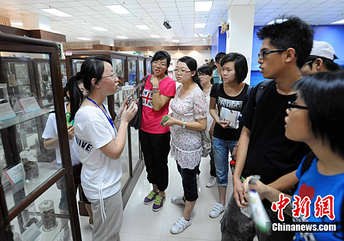 7月6日下午,臺灣高校學子參觀位于福建中醫藥大學校內的中醫藥文化博物館。由福建中醫藥大學、共青團福建省委、福建省臺灣同胞聯誼會聯合主辦的“2010年海峽兩岸青年聯歡節·中醫藥傳統文化研習營”于5日在福州開營。來自臺灣慈濟大學和臺灣嘉南藥理科技大學的32名學子及福建中醫藥大學的部分學生代表參加此次為期兩周的研習營活動。此次研習營開設有中醫藥文化、針灸學、養生藥膳、太極拳等課程。