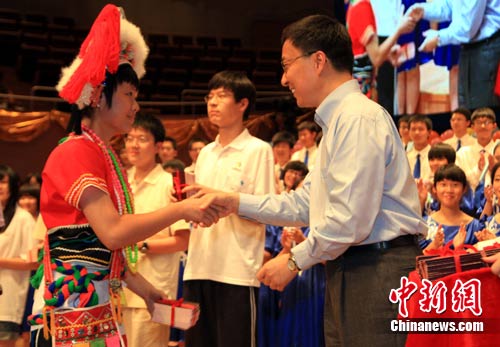 7月19日,上海市市長韓正在上海出席“2010年滬臺青少年走進世博千人夏令營”開營儀式,并向滬臺學生贈送“世博護照”。參加此次夏令營的滬臺高中各16所,兩岸學生將攜手參觀世博會、參加學生論壇、攝影比賽等活動。中新社發 潘索菲 攝