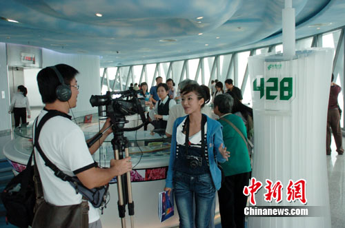 10月11日,來自臺灣中天電視《臺灣腳逛大陸》節目欄目的拍攝人員在新廣州電視塔107層,距地面428米處的廣州塔造型郵政箱前攝制節目,此前,該拍攝組已到廣州長隆動物園、廣州珠江啤酒廠等地方進行了采訪拍攝。