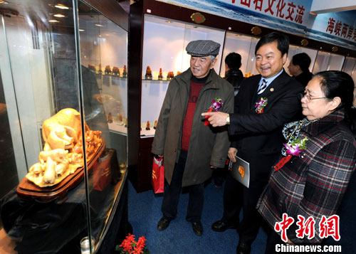 1月26日,來(lái)自海峽兩岸的2000名壽山石“石友”聚首福州進(jìn)行文化交流。當(dāng)日,由福州海峽兩岸和平統(tǒng)一促進(jìn)會(huì)、臺(tái)灣海峽兩岸和平統(tǒng)一促進(jìn)會(huì)等單位聯(lián)合主辦的2011海峽兩岸迎新春石友聯(lián)誼系列活動(dòng)在福建藏天園藝術(shù)館開(kāi)幕,為期24天的活動(dòng)將舉辦“壽山石文化交流懇談會(huì)”、“兩岸石友鬧元霄”、“非物質(zhì)文化傳承人與石友交流”等活動(dòng)。圖為臺(tái)灣“一國(guó)兩制”研究協(xié)會(huì)會(huì)長(zhǎng)蔡武璋(右二)與福州海峽兩岸交流協(xié)會(huì)會(huì)長(zhǎng)李純粹(右一)等嘉賓參加該聯(lián)誼活動(dòng)。