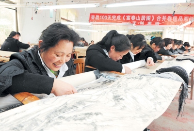 2010年底,毛勇臻經(jīng)多方努力,求得一幅《富春山居圖》合并卷全圖復(fù)制件,力邀省內(nèi)知名文博專家、原長沙市博物館副館長魏明擔(dān)綱成立繡研專家組,湘繡藝術(shù)家羅國斌、黃歡愉等專家指導(dǎo)天利湘繡公司20多位刺繡大師,按照1∶1的比率,繡制長達(dá)10米的《富春山居圖》極品湘繡合并卷。