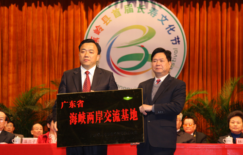 在22日廣東省蕉嶺縣舉行的首屆長壽文化節上,廣東省臺灣事務辦公室正式將“廣東省海峽兩岸交流基地”授予蕉嶺縣。據悉,這是首個由省級政府授予的海峽兩岸交流基地。海峽兩岸關系協會副會長張銘清及廣東省有關負責人出席了授牌儀式。