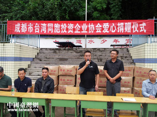 中國臺灣網(wǎng)9月4日成都消息 9月2日,成都市臺灣同胞投資企業(yè)協(xié)會常務副會長唐中柱一行前往雅安蘆山地震災區(qū),在天全縣仁義初級中學舉行了成都市臺灣同胞投資企業(yè)協(xié)會愛心捐贈儀式,向在“4.20”地震中受災的仁義中學捐贈物資。雅安市臺辦副主任時勇等陪同前往。