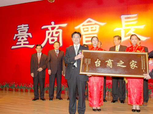 2006年8月30日,山東省臺辦主任楊慶文接受臺商會長們贈送“臺商之家”牌匾 |