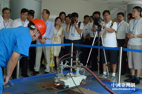參加第六屆兩岸經貿文化論壇新能源組參訪團的代表在廣州久泰能源有限公司觀看用二甲醚切割鐵板的演示(中國臺灣網 李徽 攝)