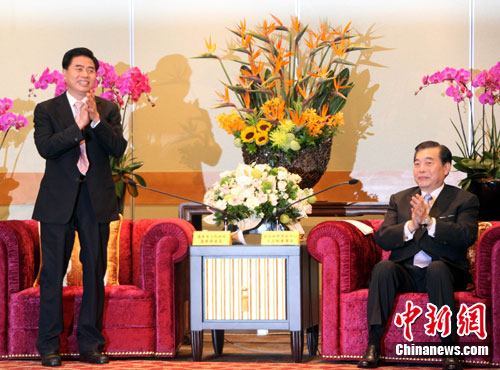 8月16日,廣東省省長黃華華(左)率團到臺北參加“臺灣·廣東周”活動。他在與臺北世貿中心董事長王志剛(右)及臺灣工商企業(yè)界人士會面時強調,廣東的發(fā)展與臺灣同胞的大力支持分不開。中新社發(fā) 劉舒凌 攝