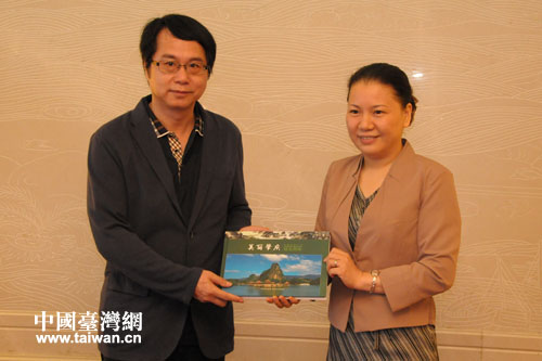 肇慶副市長陳宣群(右)向吳建宏先生致贈“美麗肇慶”畫冊。(圖片來源:肇慶市臺辦)