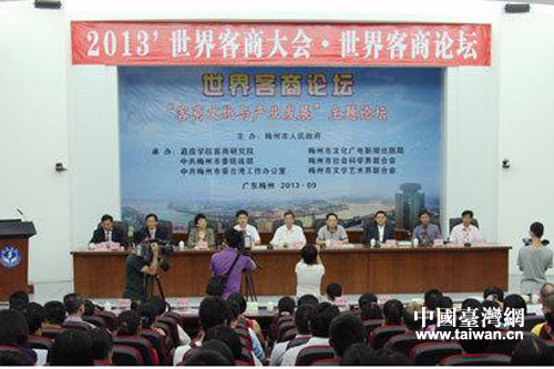 中國臺灣網9月23日梅州消息 22日下午,作為2013’世界客商大會的重要子活動——世界客商論壇在梅州市嘉應學院舉辦。此次論壇由梅州市人民政府主辦,嘉應學院客商研究院、中共梅州市委統戰部、中共梅州市委臺辦、梅州市文廣新局、梅州市社科聯、梅州市文聯承辦。此次論壇以“客商文化與產業發展”為主題,參加論壇講座的嘉賓、專家共200多人,五位海內外著名客商、商學權威學者作精彩主題發言。