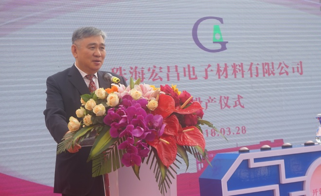 中國臺灣網3月29日珠海訊 3月28日,臺資企業珠海宏昌電子材料有限公司建成投產。珠海市政府副秘書長方小勇代表市政府致辭,高欄港經濟區黨委書記姜建平、珠海市委臺辦主任劉江成出席投產儀式。