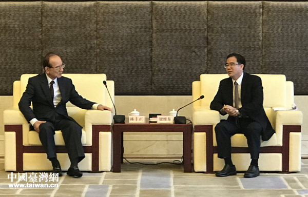 圖為東莞市委書(shū)記梁維東(右一)會(huì)見(jiàn)國(guó)民黨榮譽(yù)副主席林豐正(左一)現(xiàn)場(chǎng)。