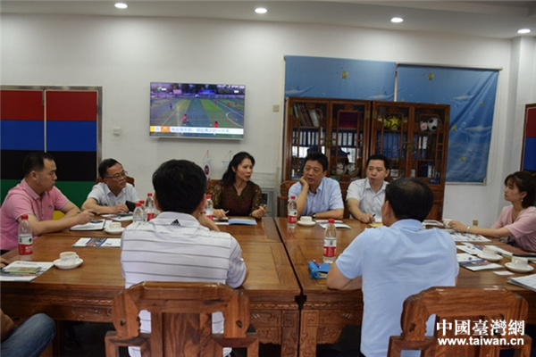 當天上午,調研組一行來到新會區(qū)體育中心參觀,并實地考察了廣東珠超聯(lián)賽有限公司,與廣東珠超聯(lián)賽有限公司董事長黃達昌及珠超臺灣球隊主教練張展維圍繞如何創(chuàng)建“廣東省海峽兩岸青少年交流基地”進行了深入座談交流。劉小青表示,海峽兩岸交流基地適應兩岸大開放、大交流的新形勢要求,突出兩岸交流地方特色,是深化兩岸經(jīng)貿文化交流合作的新平臺。江臺兩地五人制足球領域交流已具備相當基礎,希望江門能把握資源優(yōu)勢,利用珠超俱樂部平臺,發(fā)揚江臺兩地五人足球文化,共促兩地青少年交流合作,讓“兩岸一家親”理念深入人心。譚健文表示,非常感謝省臺辦對江門對臺工作的關心與支持,江門市臺辦將貫徹落實省臺辦工作要求,憑借珠超聯(lián)賽的實力基礎,打造江臺兩地青少年交流平臺,努力爭創(chuàng)“廣東省海峽兩岸青少年交流基地”,擴大江門對臺品牌的吸引力和影響力。
