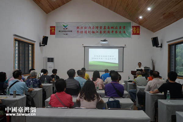 在愛麗絲莊園考察期間,參觀完觀賞南瓜種植基地后,參訪團團長張榮林在臺創(chuàng)園園區(qū)培訓(xùn)中心為參訪團全體成員舉辦了題為《系統(tǒng)農(nóng)業(yè)協(xié)助您解決2018年中央一號文件任務(wù)》的講座,幫助臺灣同胞更加深入了解中央的農(nóng)業(yè)方針政策,并鼓勵他們大膽到梅州投資創(chuàng)業(yè)。隨后,梅江臺創(chuàng)園管委會主任林峰表示熱烈歡迎臺灣同胞們到梅州來創(chuàng)業(yè)發(fā)展,臺創(chuàng)園將為臺商臺農(nóng)提供優(yōu)質(zhì)、高效、貼心的服務(wù)。(中國臺灣網(wǎng)梅江臺創(chuàng)園通訊員 楊麗君)