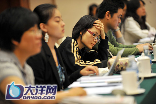 一位在臺下做筆記的女記者在代表發言間隙抱頭小歇片刻。