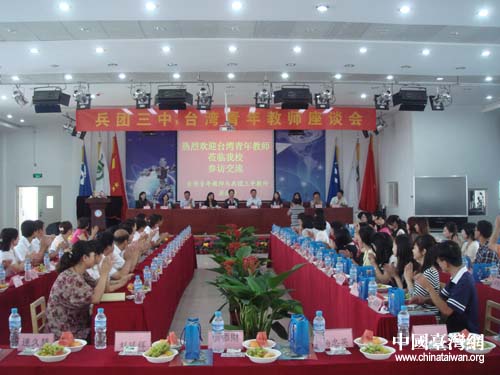 臺(tái)灣青年教師參訪團(tuán)與新疆兵團(tuán)三中教師交流座談。(圖片來(lái)源:新疆生產(chǎn)建設(shè)兵團(tuán)臺(tái)辦)
