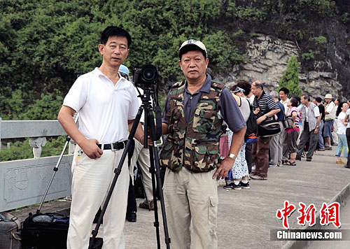 圖為臺灣高雄市攝影學會理事長郭奇男(右)與桂林市藝術攝影學會會長黃兆鳳(左)合影。中新社發 許沂 攝