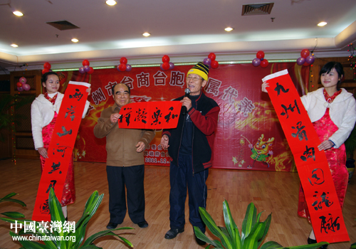 茶話會上,賀州市書法家阿三向臺商臺胞臺屬代表贈送其親自書寫的春聯,并向市臺辦贈送了書法作品“兩岸一家親”。市領導向臺商臺胞臺屬代表贈送中國結將晚會推向高潮。(中國臺灣網、賀州市臺辦聯合報道)